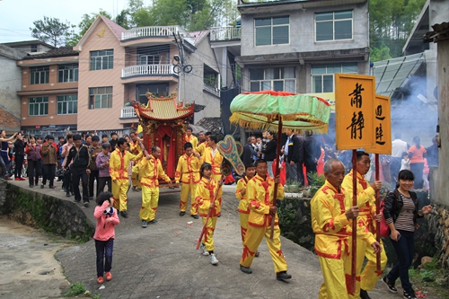媽祖“巡村”有講究 媽祖“巡村”很有講究,出巡時至少要60人才能上路,需要全幅鑾駕,即鑾傘一把、“天上圣母”街牌、“肅靜”牌、“回避”牌,以及玉斧、大刀、畫戟等12種兵器組成的器械儀仗,紅旗六面,護身童子一對(男童叫千里眼、女童叫龍女),鑼鼓手等樂隊兩套。隊伍服裝要有紅藍黃灰青五種色;出行時不能戴斗笠;參與活動的村民要衣裝整潔,而且品行好,抬媽祖轎、護身童子的必須是父母雙全、兄弟姐妹間團結和睦、德高望重的村民;抬香爐的則要求是忠厚老實的村民。