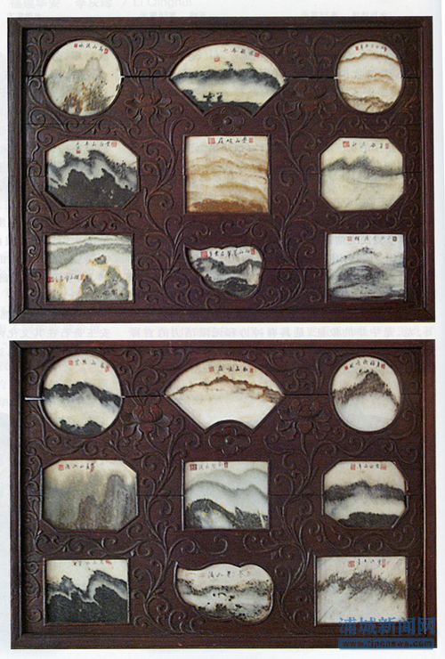 (鑒藏者 陶正晨) 云山古寺勝跡位于江西省瑞金市城西19公里處。云石山高不到50米,方園不足千平方米,山上只有一座小小的古寺廟,此山的地理風貌非常奇特,是在平地方凸起的一座小山,山上怪石林立,樹木繁多,景色怡人,四季如春。1934年7至10月,這里曾是中央蘇維埃共和國臨時中央政府所在地,并以"長征第一山"而聞名。正如山上寺廟對聯所言:"云山日詠常如畫,古寺林深不老春"。從遠處看,山巒猶如仙女回宮時遺留在凡間的花籃。云石山四面懸崖峭壁,只有一條石砌小道直達山頂,中途還有兩道石門屏障。山上的密林中孤立一塊巨石,毛澤東當年經常在這里讀書。 云山古寺也是紅一方面軍主力和中央機關長征的出發地,許多黨史學家和中央領導都稱之為"長征第一山"。 中國傳統觀賞石中,云南大理石久負盛名,其中以綠色為佳,天然形成的山水云煙如米氏畫境者為貴。 這對框架均為櫸木做的大理石掛屏,制作于清中期,每扇規格52.5*37.5厘米,浮雕精美纏枝西番蓮紋,和諧統一,中間各鑲嵌著9片大理石作為裝飾,9是數字中最大的一個,代表長久、權威、尊貴等吉祥之意。還保持完好的狀態,未見難得,最珍貴的是里面的大理石反映了清代文人神靈詩韻,里面怪石多,蒼石粼粼,雕刻完美。代表著我們浦城文人雅士具有很高的人文藝術氣質和精神境界。雖然年頭較久,但櫸木光澤依舊,紋理清晰可見。