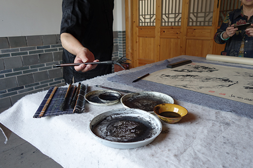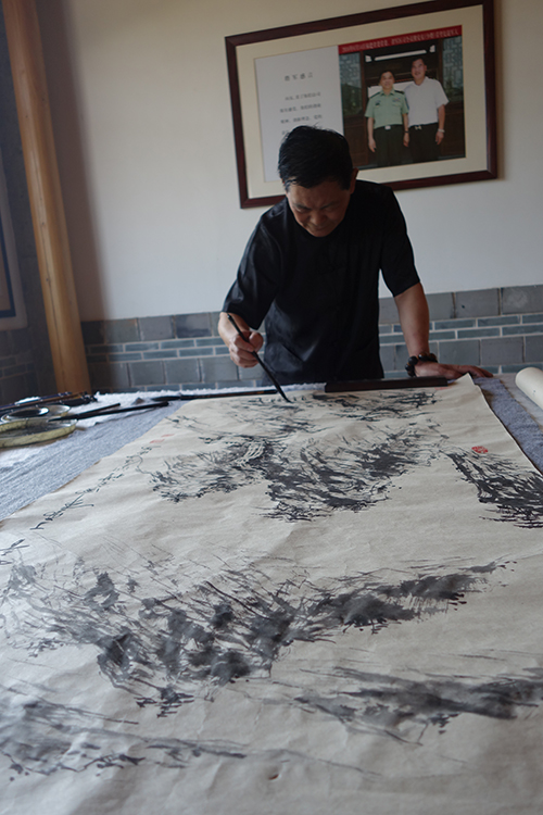 ? “來之前,我一直想象著浦城的樣子,我以為一個山區的小縣城應該是比較破舊落后的,但我沒想到浦城現在發展的這么好,山清水秀,風景優美,文化底蘊深厚,城市品位也很高,我為我出生在這樣的城市感到自豪,我今后要常來浦城寫生,把家鄉的美景,用我的畫表現出來。”談及對浦城的印象楊慶甫夸贊不停。 ? ? “破筆”如有神 楊慶甫早年師從我國南派大師黎雄才,北派大師梁樹年,擅用破筆散鋒,因而有“楊破筆”之稱。國畫大家中,傅抱石先生是有名的“破筆”,擅用破筆散鋒作山水畫。“?我這個破筆散峰就是受傅抱石先生影響,傅抱石是‘半破’,我想破一半為什么不能‘全破’。”楊慶甫告訴筆者,有一次,他看到環衛工人因為嫌竹掃把太大太重,就把掃把周圍的竹梢拔掉,這樣掃把就變得輕便,他就聯想到畫筆也可以這樣處理。“我花了十多年功夫,把畫筆全部散開,毛渣渣的,像掃把一樣的,反而用得愈發得心應手。” ? 筆桿陳舊,上面用膠布纏繞,筆鋒全散,畫完之后,從來不洗,下次接著用。就是這樣的“破筆”,楊慶甫卻把它當成最珍貴的寶貝。“我的錢包可以丟,畫筆不能丟。” ?