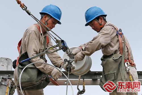 福建浦城縣供電公司員工在盤亭鄉10千伏九盤線架設線路 李義友 攝 東南網訊 “真沒想到,這么快就把線架好,我們老百姓就有電用,你們干活真的不錯,太厲害了!”7月9日中午13時,福建省浦城縣盤亭鄉柳墩村大排自然村村民黃連仁望著漸漸遠的浦城縣供電公司九牧供電所搶修人員背景,豎起大姆指連聲夸道。