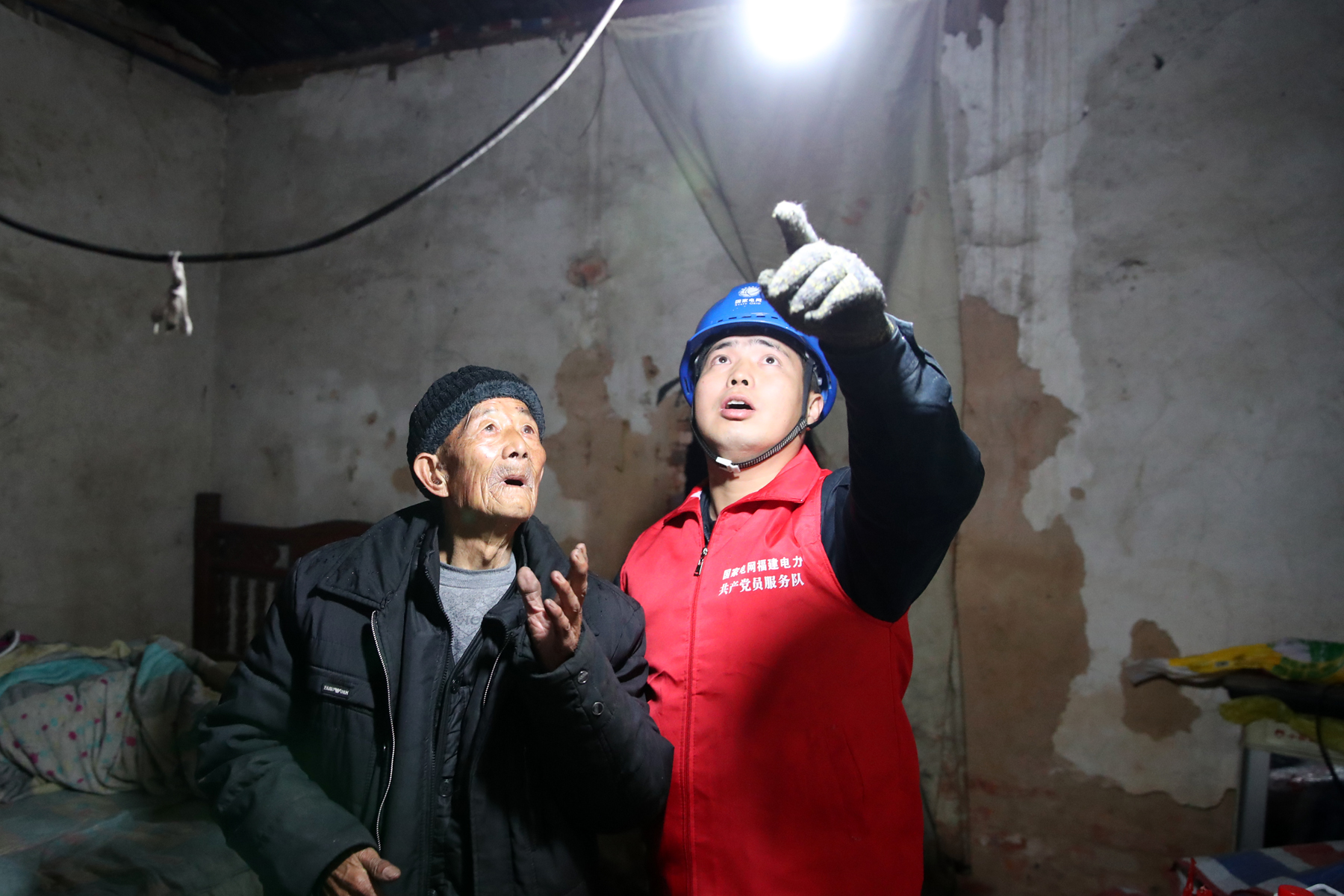 12月20日,浦城縣供電公司共產黨員服務隊為獨居老人劉傳岳安裝新線路。李義友 攝 “共產黨好,共產黨好!”12月20日傍晚,浦城縣橫山北路215號獨居87老人劉傳岳緊緊握著浦城縣供電公司城區配電搶修班顏順峰的手一直說個不停。 劉傳岳今年2月27日家中突然斷電,由于他是獨戶獨居,加之喪失聽力,無法與人交流,所以沒人知道他的情況。就這樣,沒電的日子一天天艱難的過去了。