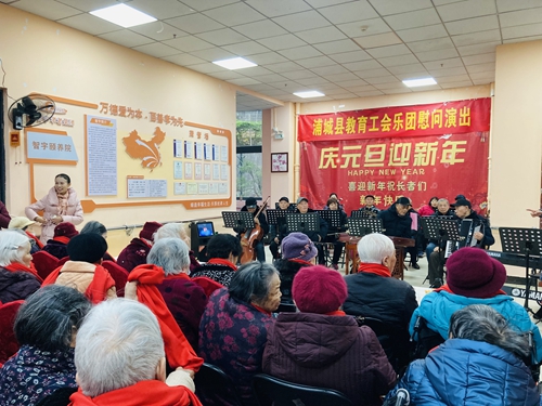 樂團為老人獻上表演 余恒毅 攝 為慶祝元旦佳節,倡導尊老、愛老風尚,豐富老年人的精神文化生活。12月25日下午,浦城縣教育工會樂團的文藝志愿者們走進智宇頤養院,為老人們送來新年的祝福。 演出開始前,福建億榮資源再生利用有限公司為老人們送上紅圍巾和衷心的節日祝福,將會場化作紅色的海洋,給節日增添了濃厚的喜慶氛圍。