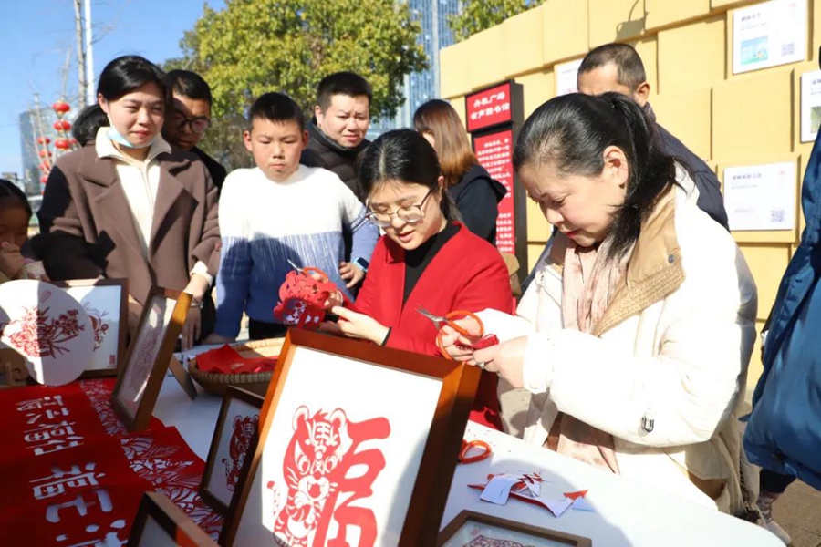 現場剪紙展示。周文倩 攝 通過此次活動不僅弘揚了傳統節日文化,還營造了濃厚的節日氛圍,使市民度過了愉快的春節,感受到了濃濃的年味兒。(周文倩) |