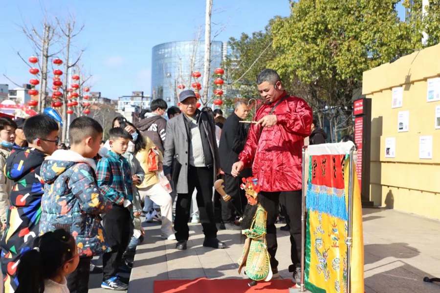 木偶戲表演。周文倩 攝 2月5日下午,浦城縣在丹桂城市廣場開展了“文化進萬家 福虎賀新春”活動,為市民朋友帶來了一場文明盛宴。 活動中,120條與詩詞文化、浦城歷史文化等主題有關的謎語懸掛在燈籠吊穗上供市民競猜,一個個喜慶的紅燈籠,一條條有趣的謎語引起了大家濃厚的興趣。在一條條謎語前大家駐足思索、絞盡腦汁,大顯神通。猜謎現場有的家人協作,有的三五成群一起討論,破解謎底,不一會,一條條謎語都被解答出來,人群中還不時爆發出贊嘆和驚呼。猜對的越戰越勇,一鼓作氣猜下一個謎語,沒猜對的也毫不氣餒,繼續開動腦筋。活動現場一片歡聲笑語,氣氛十分熱烈。