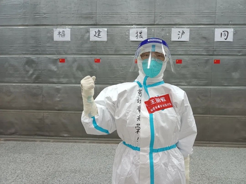 有一次,當(dāng)我剛剛把血壓計還回22區(qū)時,一位阿姨過來說:護士,我感覺心慌、害怕,你可以幫我量下血壓嗎?我重新取回血壓計給她測量,又幫她測了指脈氧,并安慰她:阿姨,不要害怕,您的各項生命指征都是正常的,安心住著,這里有這么多人,有什么不舒服或者有什么需求都可以過來跟我們說。她感激地笑笑,回我說:感覺好多了。這些看似簡單的操作,其實對于穿著笨重的防護服又要時刻做好自我防護的我們來說,都是極其不易的,但為了病人,我們總是克服重重困難,耐心細(xì)致地做好服務(wù)工作。 巡視核對病人信息的時候,有位阿姨叫住我:小護士,你衣服上寫的是你的名字嗎?我回身回答她:是的。阿姨說:我有個孫女跟你一樣的名字。我笑著回她:真的嗎?好有緣分哦。我這個名字很大眾,很多人都叫這個名字。(確實,在艙里上班已經(jīng)三次聽到有人說和我同名字的事了)轉(zhuǎn)身的時候:聽到她同另一位阿姨說,這個護士很有親和力,看起來就很好。嘿嘿,這是我今天收到的最好的禮物了吧。這種感覺,做護士的人都懂哈。第二天上班的時候,我在護理站正忙著,這位阿姨走過來很親切的和我打招呼:你今天上班啦?我開始沒太記起來,過后才反應(yīng)過來。此后幾天的班,只要遇到這位阿姨,她都很熱情的同我打招呼。她還告訴我,她也姓王,他老公也姓王。我也很熱情的跟她說:真是很有緣份,我們?nèi)倌昵斑€是一家人呢。 進艙的每一天都是“痛,并快樂著”。盡管防護服里早已因為忙碌而浸滿了汗水。 不知不覺,援滬已接近尾聲,回想這44天來的歷程,有辛苦,但更有收獲。這是我平凡的人生中一次不平凡的經(jīng)歷,一路行來,終無悔。正所謂,艱難困苦,玉汝于成,歷遍滄桑,人間值得。(王麗霞) |