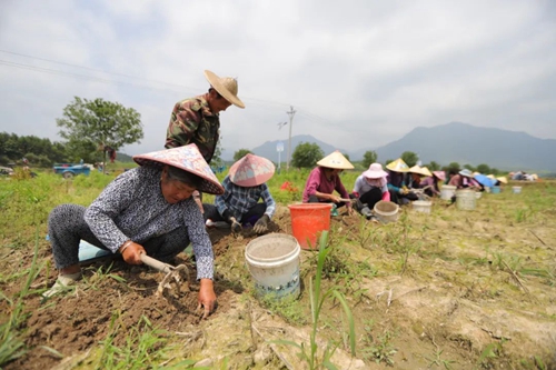 仙陽鎮(zhèn)是國家級產(chǎn)業(yè)強(qiáng)鎮(zhèn),省級鄉(xiāng)村振興特色鄉(xiāng)鎮(zhèn)。早田村通過“公司+專業(yè)戶+農(nóng)戶”的模式流轉(zhuǎn)土地,以藥稻輪作模式發(fā)展中藥材種植等產(chǎn)業(yè),每年村民勞務(wù)收入近300萬元。圖為早田村村民在田間挖藥材。(袁野 攝)
