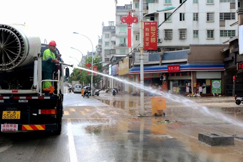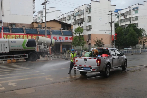 清理路面 據悉,此次抗洪清淤中,縣城管局共投入160余人次,灑水車5輛,垃圾車20輛,共加固傾斜綠化花木57株,清理淤泥300余噸、倒樹折枝70余處、樹枝樹葉等20余車,奮戰15小時,順利完成城區清淤任務。 “下一步,我局將持續集中對道路積淤點進行人機聯合作業,對出現的問題及時處置并跟進,對非正常照明設備、破損路面、低洼地帶、排水設施等進行修復提升,確保道路恢復如初。”余愛國表示。 疾控部門 6月21日,浦城縣疾控中心積極開展衛生清潔和防疫消殺工作。在城關受災嚴重區域,工作人員對沿街店鋪進行無死角消毒。隨后,用高溫高壓水槍對街道進行噴洗,清整街道衛生死角,做好汛后公共區域重點防控工作。 同時,縣疾控中心將巴氏消毒液等消殺藥劑分發給受災較重的鄉鎮(街道),并指導消殺方法、注意事項,幫助鄉鎮順利完成消殺工作。為更好讓群眾認識消殺的必要性,縣疾控中心還向群眾開展衛生知識和傳染病知識宣傳教育,全力保障居民的安全健康。