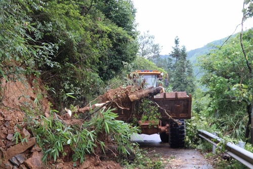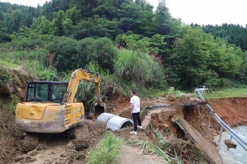 疏通道路塌方 在水尾村道路塌方路段,鎮村干部緊急調配挖掘機、推土機對道路塌方進行清理作業,疏通交通路線。同時,水北村村干部組織人員對被洪水沖斷的自來水管進行搶修,2個村6000多人的供水也已全面搶通。