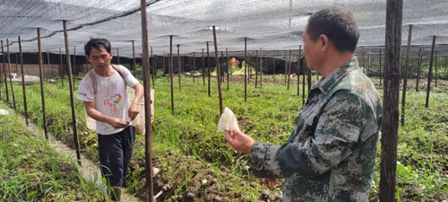 指導農戶防治病蟲害 “洪水之后,吳站長及時指導我們災后怎么做,他布置得很清楚,對恢復竹蓀生產的田間清溝排水、防治病蟲害及竹蓀的烘烤技術,他都做了技術指導,講得非常詳細?!卞┐遴l濠村村貧困戶陳軍說。