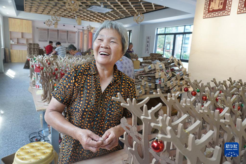 在浙江省臺州市黃巖區沙埠鎮橫溪村,村民曹素貞在村里的“共富工坊”制作工藝禮品(2022年7月12日攝)。新華社記者 王俊祿 攝 夏日清晨,浙江臺州黃巖區沙埠鎮橫溪村“共富工坊”內,十幾位老人一邊雙手翻飛制作工藝禮品,一邊拉著家常。早上6點就來上班的曹素貞是低保戶,老伴因車禍殘疾,兒子先天性聾啞。這份家門口的工作,讓她既能補貼家用,又能照顧家人。截至目前,臺州已掛牌運營“共富工坊”325個,創造就業崗位1.4萬多個,預計帶動相關農民年均增收2萬元。 先富幫后富,是推進共同富裕的題中之義。如何更好地形成先富帶后富、先富幫后富的新機制,浙江正在持續探索。