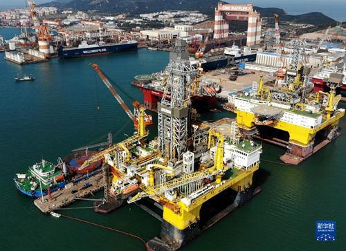 這是“藍(lán)鯨1號”(前右)及姊妹平臺“藍(lán)鯨2號”(前左)在其生產(chǎn)基地中集來福士海洋工程有限公司煙臺基地進(jìn)行維護(hù)和保養(yǎng)(2021年10月18日攝,無人機(jī)照片)。新華社記者 李紫恒 攝 發(fā)展格局持續(xù)刷新。“推動海洋強(qiáng)省建設(shè)”是習(xí)近平總書記2018年6月在山東考察時(shí)作出的部署。山東沿著習(xí)近平總書記指引的方向,陸海統(tǒng)籌、向海圖強(qiáng)。建成海洋船舶、海洋重工、海洋石油裝備三大海工裝備制造基地;自主設(shè)計(jì)研發(fā)的“藍(lán)鯨1號”“藍(lán)鯨2號”鉆井平臺赴南海試采可燃冰……2021年,山東海洋生產(chǎn)總值14942.1億元,占全國海洋生產(chǎn)總值的16.5%。