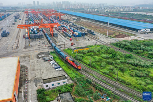 滿載著電子產(chǎn)品、機械零件、日用百貨等貨物的中歐班列(重慶)第10000列列車從重慶團結(jié)村中心站駛出(2022年6月23日攝,無人機照片)。新華社記者 黃偉 攝 中歐班列成功運行后,重慶又開通了“渝桂新”南向通道。這條通道北接絲綢之路經(jīng)濟帶,南連21世紀海上絲綢之路,協(xié)同銜接長江經(jīng)濟帶,所承載的貨物流向107個國家和地區(qū)的319個港口,涵蓋640多種產(chǎn)品。 重慶不僅參與構(gòu)建國際物流大通道,還依托自貿(mào)試驗區(qū)、中新互聯(lián)互通項目等,匯聚全球各類開放要素,做大做強開放平臺。據(jù)統(tǒng)計,2021年,世界500強企業(yè)有312家入駐重慶,較2012年增加了近100家。