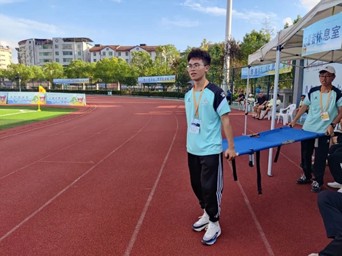 志愿者奔走在賽場上,做好撿球工作 揮灑青春汗水 爭做“貼心”后勤 柯毅鵬是一名就讀于福建信息職業技術學院大一的學生,在足球比賽期間,他在擔架組承擔著抬擔架的工作,一組4人,全天候8小時待命,與太陽肩并肩。強烈的責任感,讓他即使中暑也是喝下藿香正氣水后,立馬歸隊。他說:“我必須守著,守著運動員,這樣心里才安心?!?/span> 賽場上有運動員受傷,擔架隊的隊員第一時間抬著擔架趕到,為運動員爭取了更多時間緩解疼痛??吹揭幻軅倪\動員因抽筋導致大哭時,擔架隊隊員一起調整方案,四人保持統一高度,并安慰運動員,轉移運動員的思緒,并用最快的速度將她送到醫務室。 柯毅鵬說,面對辛苦的運動員,自己唯一能做的就是提供最好的服務,讓他們練得順心,賽得快樂,贏得自豪。雖然自己的服務不能算最好的,但也是盡己所能認真地對待每一件小事。