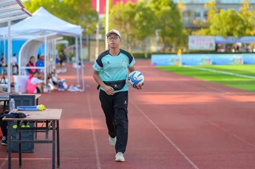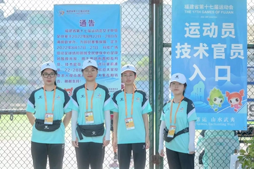 場外組 為提供更優質的后勤保障服務,足球比賽期間,志愿者根據自身的特點和所學的專業,分別被編排到安檢組、檢錄組、撿球組、禮儀組、跟車組、機動組等組別中。炎熱的天氣,并沒有影響到志愿者的服務品質,他們用飽滿的熱情,守護著賽場的安全與秩序;他們站在場館最前線,用挺拔的身姿筑牢省運的一道最堅固的“壁壘”;他們高舉手中的指示牌,用最溫暖的笑容為場上運動員引導方向;他們用手中的相機,記錄下比賽的每一個精彩瞬間;他們維持著場外秩序,確保各類車輛快速有效地疏通;他們是球場周圍的一抹藍,與運動員同頻共振……他們是返鄉大學生、是高三畢業生、是干部職工,在省運會浦城賽區比賽期間,我們聽到許多關于他們的故事。 青春遇上“省運” 成長不期而遇 在聽說浦城賽區要招募省運會志愿者時,今年高中畢業的潘錦陽立即報名參加,并經過層層選拔和面試,成為一名省運會志愿者。在青少年女子足球賽中,他主要承擔球童的職責,看似簡單的工作,潘錦陽卻不斷地重復做,練習如何更快更好的撿球。 在一次撿球的過程中,由于急于接球,他的手指被球撞傷??吹角騿T們揮灑汗水的身影,他咬牙堅持強忍著手指腫脹的疼痛,繼續堅守在崗位上,直到比賽結束。說到省運會,他笑著說,雖然韌帶損傷,但仍然想要繼續為省運會奉獻自己的力量。 在足球比賽中,撿球工作是需要長期在烈日下暴曬的,工作量大、工作時間長,是難度相對大的崗位。洪揚鑫卻說:“作為一名志愿者,我們要服務好來到我們浦城比賽的每位運動員們,讓她們能有最好的狀態;要發揚好我們東道主的精神,讓運動員們在浦城留下美好的印象;要在服務中展現浦城志愿者的精神面貌,還要證明我們00后能吃苦,不怕吃苦的精神!”