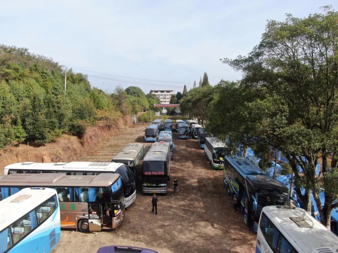 11月1日,在浦城縣石陂鎮(zhèn)國有林場大門的兩輛大巴車正準(zhǔn)備出發(fā)轉(zhuǎn)運物資,進(jìn)門右手邊坡下兩排帳篷整齊地排列著,坡上的一片空地上停著二十幾輛大巴車。這些大巴車有的來自于周邊各個縣(市、區(qū)),載著疫情防控人員和物資逆行而來。