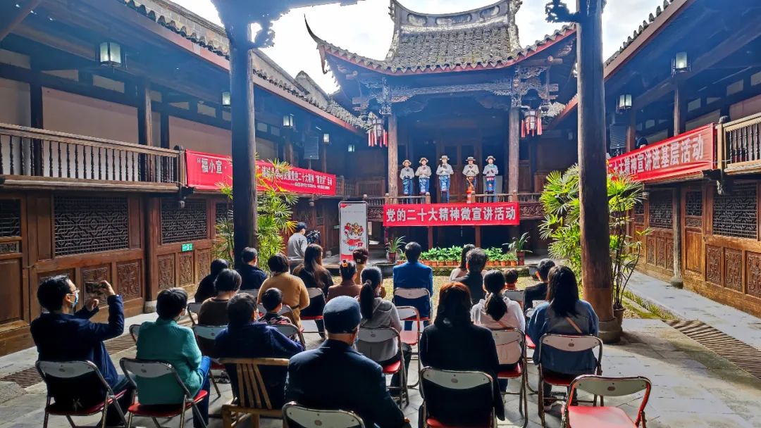 精彩的手鼓表演 11月20日,在省級文保單位三山會館內,“福小宣·‘浦’新篇”宣講隊的十余名微宣講員通過木偶表演、手鼓表演、詩歌朗誦等文藝表演方式,把黨的二十大的重要意義、奮斗目標及浦城的新發展、新變化等講給現場的觀眾聽。簡潔的語言、活潑的形式,不僅讓觀眾能聽得懂,更能記得住,真正實現把黨的“好聲音”傳遞到群眾的心坎里。“這次宣講形式很好,寓教于樂,通俗易懂,不僅宣傳了黨的二十大精神,也讓我們更深刻地感受到了祖國和家鄉日新月異的變化。”黨員蔡心頗有感觸地說,作為一名基層共產黨員,他將堅定不移聽黨話,感黨恩、跟黨走,多為群眾辦實事、做好事。“我們將繼續深入學習領會黨的二十大精神,同時借助三山會館、真德秀坊等文化遺跡,開展形式多樣的宣講活動,推動黨的政策理論在基層落地開花。”河濱街道黨委宣傳委員朱若冰表示。