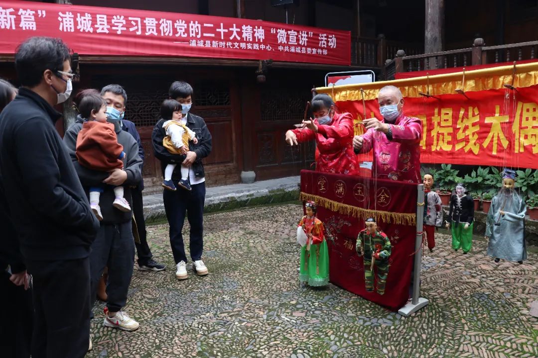 “社會主義現代化,富國強軍與時進。萬眾同心圓一夢,中華民族要復興……”非遺傳承人們結合當地傳統文化提線木偶表演,講述著祖國和家鄉的發展變化;“糧食安全是底線,耕地保護是重點,科教興國好戰略,創新發展靠人才……”伴隨精彩的手鼓表演,宣講隊員們將黨的二十大精神娓娓道來。