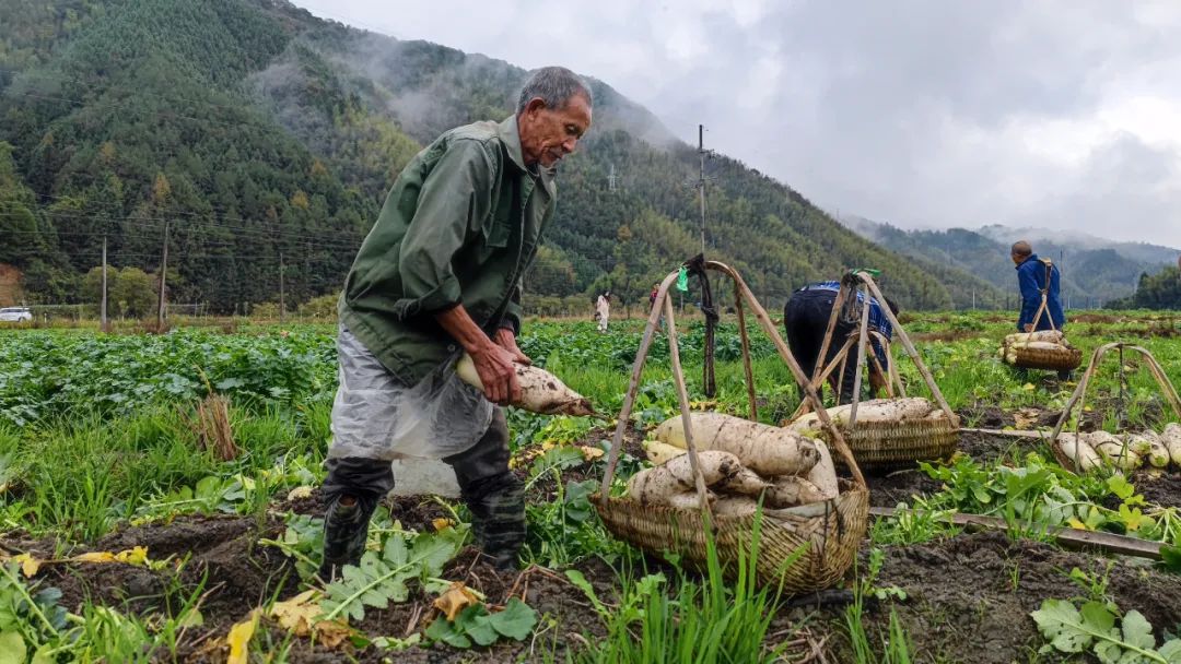 村民們在拔蘿卜 “我們重新翻耕了‘冬閑田’,并及時種植了500多畝的蘿卜、包菜、大白菜等蔬菜。目前在采收的這片蘿卜是9月份種植的,畝產達到了1.2萬斤以上。縣商務局還幫我們聯系了商超和農貿市場,銷售不用愁。”浦城縣臨江鎮的種糧大戶馬芳華告訴記者。 黨的二十大報告中提出,“全面推進鄉村振興,堅持農業農村優先發展,鞏固拓展脫貧攻堅成果,加快建設農業強國”。 馬芳華在福建農林大學林文雄教授的科特派團隊指導下,利用冬閑田種植蔬菜。“利用冬閑田種植蘿卜,不僅可盤活土地,解決冬閑田撂荒問題,蘿卜葉子還能還田做有機肥,改善土壤結構,減輕病蟲害和雜草危害,增加土地效益。而且,從品種選擇到培育、管理,只要有問題,科特派們都第一時間進行指導。”馬芳華說。