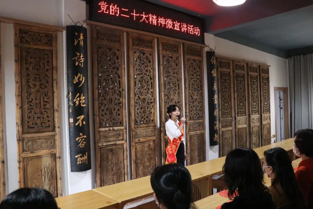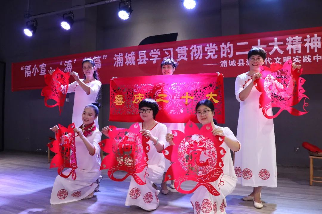“福小宣·‘浦’新篇”新時代微宣講活動走進剪花嫂剪紙坊 宣講員言語從容舒緩,將黨的二十大精神與振奮人心的發(fā)展故事娓娓道來;“剪花嫂”們配樂表演“藝心永向黨”,紅紙絮碎姍姍而下,充分展示了浦城剪紙的獨特魅力;國家非遺項目浦城剪紙省級非遺傳承人周冬梅講述了《喜慶二十大》剪紙作品創(chuàng)作初衷,現(xiàn)場觀眾在欣賞作品之余,也紛紛拿起紅紙與剪刀,體驗非遺文化的魅力。