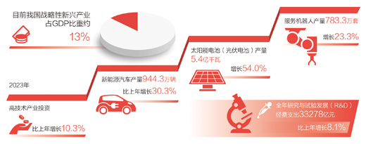 數(shù)據(jù)來源:工業(yè)和信息化部、國(guó)家統(tǒng)計(jì)局 習(xí)近平總書記強(qiáng)調(diào):“發(fā)展新質(zhì)生產(chǎn)力是推動(dòng)高質(zhì)量發(fā)展的內(nèi)在要求和重要著力點(diǎn),必須繼續(xù)做好創(chuàng)新這篇大文章,推動(dòng)新質(zhì)生產(chǎn)力加快發(fā)展”“整合科技創(chuàng)新資源,引領(lǐng)發(fā)展戰(zhàn)略性新興產(chǎn)業(yè)和未來產(chǎn)業(yè),加快形成新質(zhì)生產(chǎn)力”。 今年以來,各地區(qū)各部門在發(fā)展新質(zhì)生產(chǎn)力上勇爭(zhēng)先、善作為、謀新策、出實(shí)招。代表委員表示,新時(shí)代新征程,要大力發(fā)展新能源、新材料、先進(jìn)制造、電子信息等戰(zhàn)略性新興產(chǎn)業(yè),積極培育未來產(chǎn)業(yè),加快形成新質(zhì)生產(chǎn)力,增強(qiáng)高質(zhì)量發(fā)展新動(dòng)能。 新質(zhì)生產(chǎn)力是符合新發(fā)展理念的先進(jìn)生產(chǎn)力質(zhì)態(tài) 習(xí)近平總書記強(qiáng)調(diào):“新質(zhì)生產(chǎn)力是創(chuàng)新起主導(dǎo)作用,擺脫傳統(tǒng)經(jīng)濟(jì)增長(zhǎng)方式、生產(chǎn)力發(fā)展路徑,具有高科技、高效能、高質(zhì)量特征,符合新發(fā)展理念的先進(jìn)生產(chǎn)力質(zhì)態(tài)”。 代表委員表示,新質(zhì)生產(chǎn)力已經(jīng)在實(shí)踐中形成并展示出對(duì)高質(zhì)量發(fā)展的強(qiáng)勁推動(dòng)力、支撐力。加快發(fā)展新質(zhì)生產(chǎn)力,有利于建設(shè)現(xiàn)代化產(chǎn)業(yè)體系。 “新質(zhì)生產(chǎn)力特點(diǎn)是創(chuàng)新,關(guān)鍵在質(zhì)優(yōu),本質(zhì)是先進(jìn)生產(chǎn)力,對(duì)于加快建設(shè)現(xiàn)代化產(chǎn)業(yè)體系具有重要意義?!蓖ㄓ眉夹g(shù)集團(tuán)黨組書記、董事長(zhǎng)于旭波代表說,通用技術(shù)集團(tuán)與重慶理工大學(xué)共同推進(jìn)納米時(shí)柵技術(shù)產(chǎn)業(yè)化,廣泛應(yīng)用于高檔數(shù)控機(jī)床、機(jī)器人領(lǐng)域,助力國(guó)內(nèi)高端裝備產(chǎn)業(yè)發(fā)展。 中國(guó)科學(xué)院院士趙宇亮委員表示,加快發(fā)展新質(zhì)生產(chǎn)力,有利于建設(shè)具有完整性、先進(jìn)性、安全性的現(xiàn)代化產(chǎn)業(yè)體系。 加快形成新質(zhì)生產(chǎn)力,打造經(jīng)濟(jì)增長(zhǎng)新引擎。2023年,我國(guó)新能源汽車產(chǎn)量達(dá)944.3萬(wàn)輛,比上年增長(zhǎng)30.3%;太陽(yáng)能電池(光伏電池)產(chǎn)量達(dá)5.4億千瓦,增長(zhǎng)54.0%;服務(wù)機(jī)器人產(chǎn)量783.3萬(wàn)套,增長(zhǎng)23.3%。 “發(fā)展新質(zhì)生產(chǎn)力,既有利于培育發(fā)展一批產(chǎn)業(yè)規(guī)模大、帶動(dòng)能力強(qiáng)的支柱產(chǎn)業(yè),也有利于加快傳統(tǒng)產(chǎn)業(yè)轉(zhuǎn)型升級(jí),增強(qiáng)我國(guó)經(jīng)濟(jì)發(fā)展韌性,推動(dòng)經(jīng)濟(jì)實(shí)現(xiàn)質(zhì)的有效提升和量的合理增長(zhǎng)。”中山大學(xué)黨委副書記、校長(zhǎng)高松代表說。2023年,我國(guó)高技術(shù)制造業(yè)增加值增長(zhǎng)2.7%,高技術(shù)產(chǎn)業(yè)投資比上年增長(zhǎng)10.3%,新動(dòng)能不斷積蓄。 中國(guó)鐵道建筑集團(tuán)有限公司黨委書記、董事長(zhǎng)戴和根委員表示,新質(zhì)生產(chǎn)力由技術(shù)革命性突破、生產(chǎn)要素創(chuàng)新性配置、產(chǎn)業(yè)深度轉(zhuǎn)型升級(jí)而催生,以勞動(dòng)者、勞動(dòng)資料、勞動(dòng)對(duì)象及其優(yōu)化組合的躍升為基本內(nèi)涵,以全要素生產(chǎn)率大幅提升為核心標(biāo)志。 加快形成新質(zhì)生產(chǎn)力,有利于塑造國(guó)際競(jìng)爭(zhēng)新優(yōu)勢(shì)。 “當(dāng)前,新一輪科技革命和產(chǎn)業(yè)變革深入發(fā)展,科技創(chuàng)新是重中之重?!敝袊?guó)工程院院士、鵬城實(shí)驗(yàn)室主任高文代表說,哪個(gè)國(guó)家擁有先進(jìn)科學(xué)技術(shù),擁有處于世界領(lǐng)先地位的戰(zhàn)略性新興產(chǎn)業(yè)和未來產(chǎn)業(yè),哪個(gè)國(guó)家就更有可能贏得發(fā)展主動(dòng)權(quán)。 高松代表表示,中國(guó)式現(xiàn)代化關(guān)鍵在科技現(xiàn)代化,要把握好新一輪科技革命和產(chǎn)業(yè)變革帶來的巨大機(jī)遇,加快形成新質(zhì)生產(chǎn)力,打造新優(yōu)勢(shì)。 科技創(chuàng)新是發(fā)展新質(zhì)生產(chǎn)力的核心要素 習(xí)近平總書記指出:“科技創(chuàng)新能夠催生新產(chǎn)業(yè)、新模式、新動(dòng)能,是發(fā)展新質(zhì)生產(chǎn)力的核心要素?!?/span> 代表委員表示,必須加強(qiáng)科技創(chuàng)新特別是原創(chuàng)性、顛覆性科技創(chuàng)新,加快實(shí)現(xiàn)高水平科技自立自強(qiáng),打好關(guān)鍵核心技術(shù)攻堅(jiān)戰(zhàn),培育發(fā)展新質(zhì)生產(chǎn)力的新動(dòng)能。 加快原創(chuàng)性、顛覆性科技創(chuàng)新,培育發(fā)展新質(zhì)生產(chǎn)力的強(qiáng)勁動(dòng)能。 “發(fā)展新質(zhì)生產(chǎn)力,需要依靠‘從0到1’的科技創(chuàng)新,通過原創(chuàng)性、顛覆性、前沿性的技術(shù)突破,打造高質(zhì)量發(fā)展的動(dòng)力引擎?!庇谛癫ù碚f,2023年,我國(guó)全年研究與試驗(yàn)發(fā)展(R&D)經(jīng)費(fèi)支出33278億元,比上年增長(zhǎng)8.1%。中央企業(yè)要進(jìn)一步發(fā)揮創(chuàng)新主體