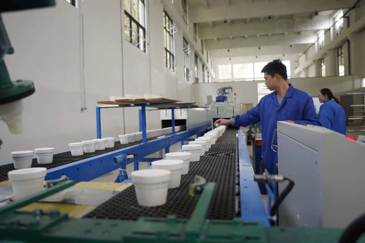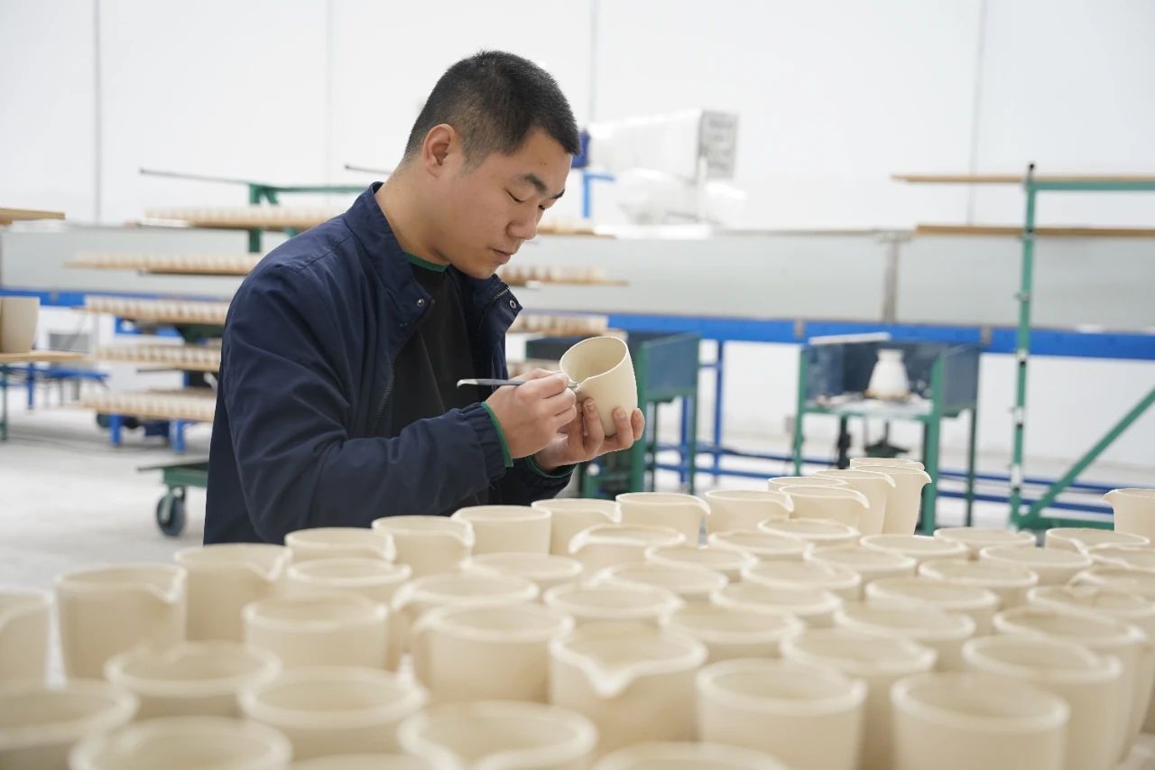 流水線生產(chǎn)素坯 “去年年底,我們正式入駐了產(chǎn)業(yè)園,開始了機(jī)械化、標(biāo)準(zhǔn)化、規(guī)模化的生產(chǎn)。”李天保說,2023年,浦城縣委、縣政府高標(biāo)準(zhǔn)規(guī)劃建設(shè)了占地33畝青白瓷文化創(chuàng)意產(chǎn)業(yè)園,建成1180平方米的青白瓷陶瓷燒制、儲(chǔ)存廠房及生產(chǎn)線,可年產(chǎn)150萬套茶器皿。陳雪芳與李天保入駐后,他們傳承發(fā)展大口窯青白瓷的事業(yè)也走上了“快車道”。 “比起原來的手工、機(jī)械,現(xiàn)在流水線生產(chǎn)快了實(shí)在太多。現(xiàn)在每小時(shí)可壓制600個(gè)素坯,等以后我們培訓(xùn)的工人熟練了,生產(chǎn)效率預(yù)計(jì)能提升2倍左右,批量制作能降低20%至30%左右的成本。”李天保說,自入駐以來,目前該基地已研發(fā)了標(biāo)準(zhǔn)巖茶器皿系列、會(huì)議杯5個(gè)系列、茶擺件2個(gè)系列、餐具2個(gè)系列等,各系列產(chǎn)品共計(jì)3萬余套已投向市場。據(jù)了解,為進(jìn)一步擴(kuò)大產(chǎn)能,該生產(chǎn)基地今年正在擴(kuò)建,計(jì)劃在原有的標(biāo)準(zhǔn)茶器生產(chǎn)線之外,新建1200平米的生產(chǎn)廠房,設(shè)計(jì)新的餐具、酒器等青白瓷器具生產(chǎn)流水線。 從“小作坊”到“大工廠”的升級(jí),對(duì)于陳雪芳和李天保夫婦來說是個(gè)不小的挑戰(zhàn)。“流水線生產(chǎn)工藝、人員管理培訓(xùn)、市場營銷,我們都沒有特別多的經(jīng)驗(yàn)。”李天保說,“好在政府給予了非常大的支持,工廠在短短幾個(gè)月的時(shí)間內(nèi)迅速建成落地,還給了我們場地和設(shè)備兩年免租的政策,運(yùn)營銷售方面也有產(chǎn)業(yè)發(fā)展公司提供指導(dǎo)。目前生產(chǎn)銷售穩(wěn)定,市場需求旺、反響好,我們非常有信心。”