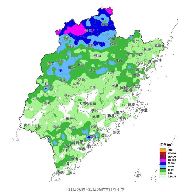 6月9日08時~12日12時我縣已出現持續性強降水,全縣普降大暴雨。經統計,全縣共有47個站點過程累積雨量超過100毫米,其中有10個站點過程累積雨量超過250毫米,以石陂鎮梨嶺村312.8毫米為最大,城區為246.0毫米;最大小時雨強為永興鎮連源村48.0毫米。 過去24小時(11日12時~12日12時)我縣普降大雨到暴雨,少數鄉鎮大暴雨。經統計,我縣共有34個站點日降雨量超過50毫米,其中有3個站點日降雨量超過100毫米,以蓮塘鎮106.0毫米為最大,城區為75.2毫米;最大小時雨強為永興鎮連源村48.0毫米。