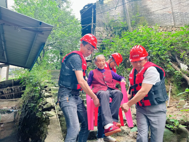 96歲老人余金珠在鎮(zhèn)村干部的幫助下成功轉移至安置點 仙陽鎮(zhèn)仙陽村村民吳秀蓮今年75歲,家庭比較困難,房屋簡陋,住在一處高陡邊坡附近。家中有96歲老母親和50多歲的殘疾弟弟在家,兩人都行動困難。仙陽鎮(zhèn)黨委副書記伍吉忠是該村的掛點領導,得知吳秀蓮的情況后,伍吉忠?guī)е申柎宕逯鞲稍洹⒏敝魅沃旖埲笋R上跑到了吳秀蓮家里,三人如同“抬轎”一般帶著老人轉移,一路上,三人和老人搭著話,時刻關心著老人的身體狀況,走過布滿了青苔的臺階,汗水早已濕透了衣服。20幾分鐘后,老人順利上了車。“我沒事,倒是你們實在太辛苦了。”老人感激地說。 在河濱街道,建設社區(qū)的80歲老人余文珠在安置點君悅酒店正在看著電視,又迎來了熟悉的“客人”,建設社區(qū)黨委書記宋小蘭來看望她。“吃得好不好?”“住得舒適不舒適?”“有什么需要?”這是宋小蘭每天都關心的問題。為做好近期防汛工作,她每天都會來查看轉移居民的生活情況,防止人員回流的同時,為他們解決各種問題。這一來二去,她成了他們眼中的“自家人”。“你這么關心我,跟我女兒一樣地親!我住得比在家里可舒服多了!”老人余文珠感慨地說。 迎難更上戰(zhàn)風雨,關鍵時刻顯擔當。為及時應對災情、險情,浦城縣提前謀劃,縣防指于6月12日啟動12支應急救援方陣,出動預置力量114人、91臺車輛,攜帶各類防汛應急救援器材奔赴富嶺、仙陽、石陂等11個片區(qū)做好救援準備。汛期各部門履職盡責,奮戰(zhàn)在一線,交通部門派出巡查隊伍5支,出動1253人次,第一時間合力安排搶通24處道路阻斷;住建部門緊盯房屋安全,出動3335人次,排查汛期易受災危老舊房屋8524棟;供電部門瞄準保供保暢,及時恢復故障線路4條、配變63臺次、2235戶用電……