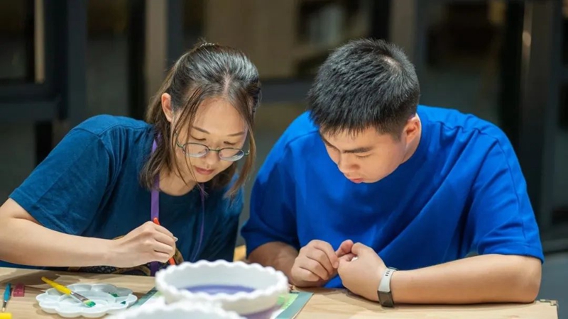 對孩子們的作品進行指導 對于大多數“夢筆生花”學員而言,與特殊兒童進行美育互動應屬首次。用創作思維強化特殊兒童自我意識,尋求自我價值,療愈障礙心理,是浦城美術館/范迪安美術館面對當下美育探究藝術治療工作路徑的全新探索。 福建省心啟航助殘幫扶中心理事長張秀麗介紹:“繪畫干預作為一種藝術治療形式,通過創造性的表達幫助個體處理情緒問題、改善心理健康并促進個人成長?!彼囆g治療為孤獨癥兒童提供了一個獨特的表達和溝通方式,有助于他們在情感、社交和認知方面的整體發展。 福至心靈ASD青少年教育發展公益中心張小麗表示,希望通過本次活動能讓更多的人了解這些“星星的孩子”,也希望更多的人能通過畫作走進他們豐富多彩的內心世界,架起一座包容關愛的橋梁,共建一個和諧平等的友愛環境。(黃乾曄 周文倩) |