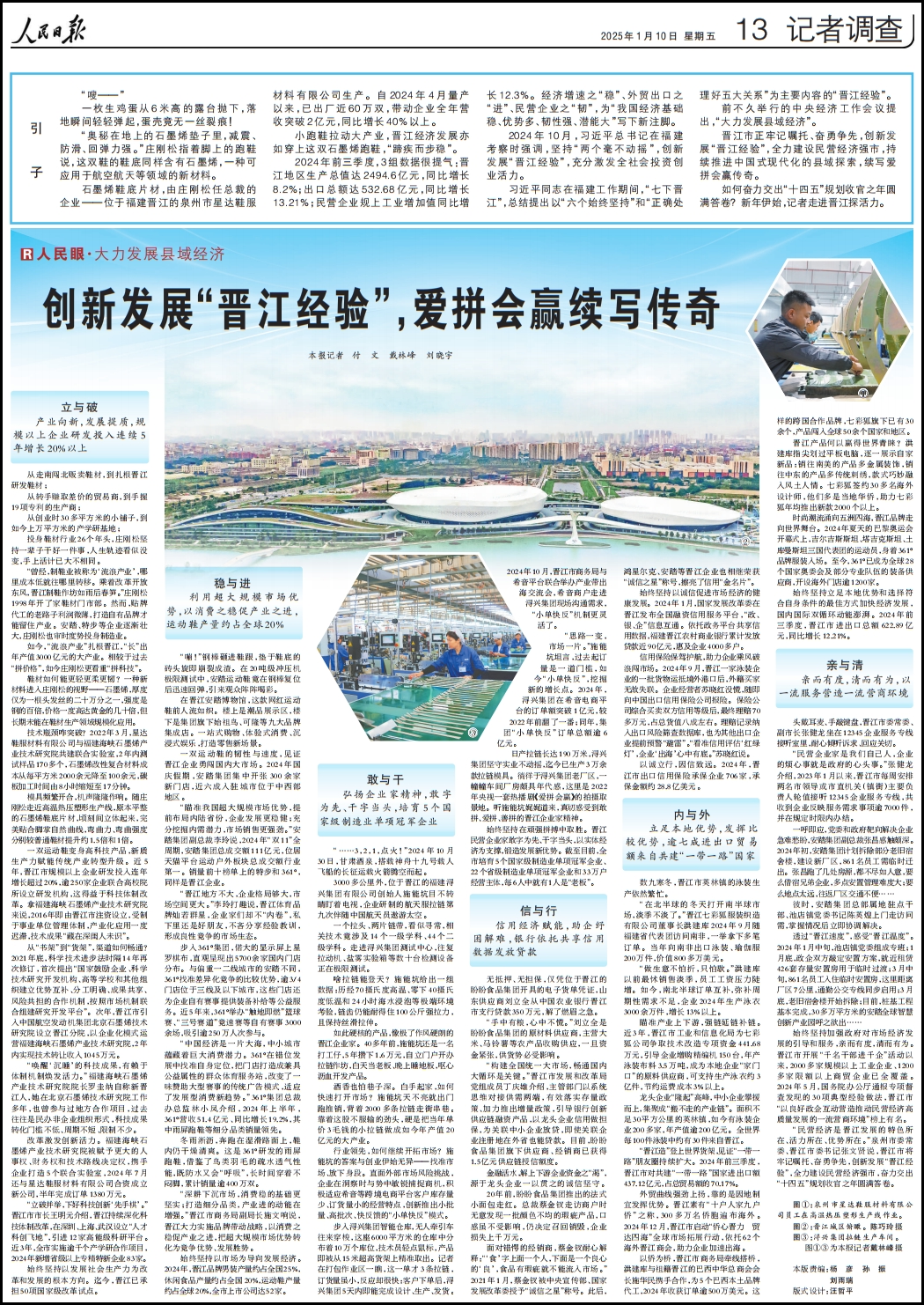 1月10日,人民日報記者調查版刊發整版報道《創新發展“晉江經驗”,愛拼會贏續寫傳奇》,聚焦福建晉江創新發展“晉江經驗”,持續推進中國式現代化的縣域探索, 經濟增速之“穩”、外貿出口之“進”、民營企業之“韌”,為“我國經濟基礎穩、優勢多、韌性強、潛能大”寫下新注腳。