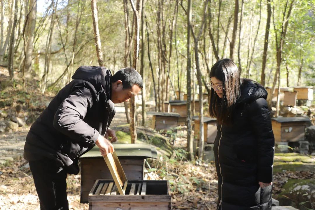 劉全旺(左)正在觀察蜜蜂 黨溪村是國家級森林康養(yǎng)基地、省級鄉(xiāng)村振興示范村、省級森林村莊、省級生態(tài)村。劉全旺是黨溪村村民,家鄉(xiāng)群山環(huán)抱、生態(tài)優(yōu)美,讓他萌生了在家鄉(xiāng)養(yǎng)蜂的想法。于是他從2014年開始在茶坪自然村進行蜜蜂養(yǎng)殖。 “這里四季花開不斷,有野花、果花、菜花……蜜蜂能采到不同季節(jié)、不同種類花的營養(yǎng)。”劉全旺介紹,得天獨厚的自然環(huán)境,為養(yǎng)殖蜜蜂提供了有利條件,因此他的土蜂蜜口感好,營養(yǎng)價值高。據(jù)了解,劉全旺主要養(yǎng)殖中華蜂,生產(chǎn)蜂蜜、巢蜜、蜂膠、花粉、蜂王漿、蜂子酒等系列產(chǎn)品,以純天然、健康的蜂蜜產(chǎn)品慢慢地打出了自己的品牌。