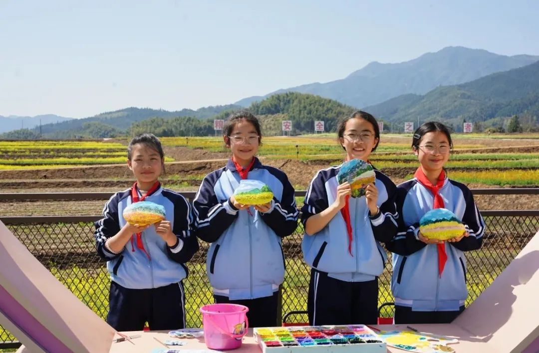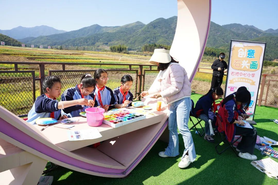 “油菜花田太美了,我超級興奮,感覺靈感源源不斷,畫里的顏色都感覺更鮮艷了!”3月21日,浦城縣石陂鎮中心小學組織學生前往石陂鎮申明村科技小院前的油菜花田開展繪畫研學活動,以“石”為紙,親近自然,促進學生全面發展。 油菜花田色彩鮮艷,生機勃勃,不僅能激發孩子們的觀察力和對美的感知,同時還能為孩子們帶來多維度成長和新奇的體驗。在老師的指導下,10位同學有序地找到自己的“創作據點”,拿出畫筆和石頭,以純真的視角和靈動的筆觸,將眼前的美景一點點呈現在石頭之上。有的同學專注于描繪單株油菜花的精致細節,觀察花瓣的紋理、花蕊的形狀,體會微觀世界的精妙之美;有的同學則著眼于整片盛開的整片花海,把握色彩的層次、田野與天空的構圖關系,領略宏觀視野下的田園之美。同學們相互交流、彼此欣賞,分享著創作心得,現場充滿了歡聲笑語和濃厚的藝術氛圍。