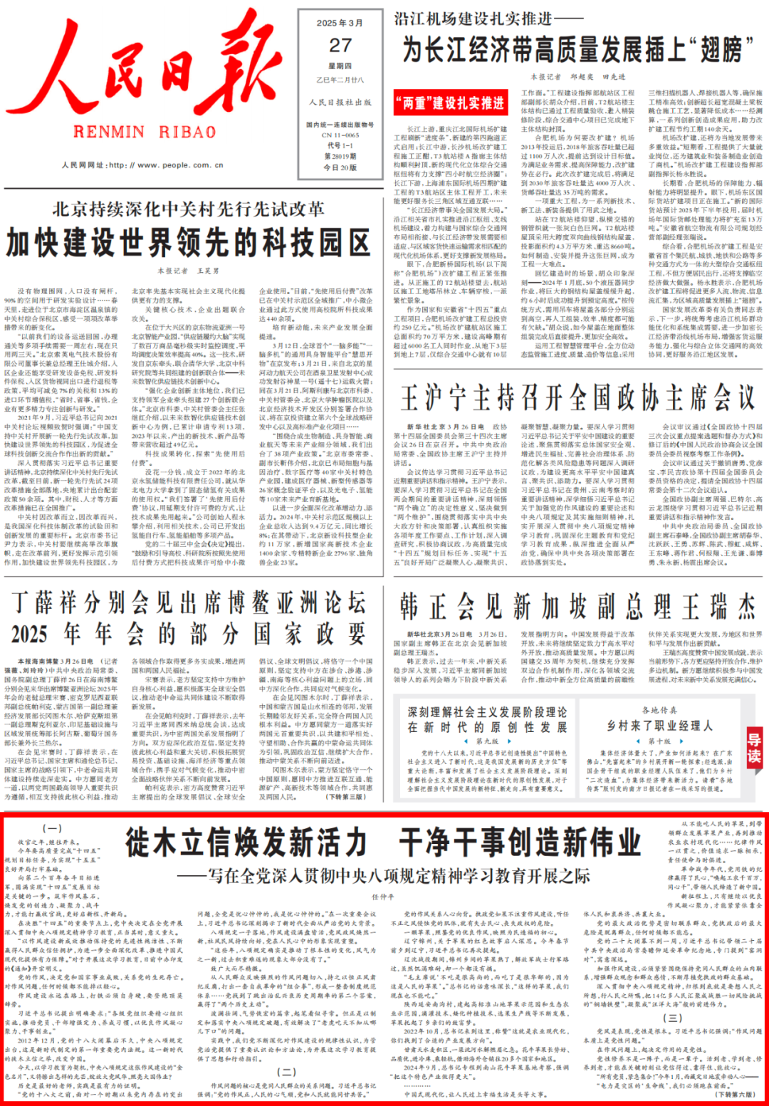 (一) 收官之年,繼往開來。 今年要高質(zhì)量完成“十四五”規(guī)劃目標(biāo)任務(wù),為實現(xiàn)“十五五”良好開局打牢基礎(chǔ)。 向第二個百年奮斗目標(biāo)進(jìn)軍,圓滿實現(xiàn)“十四五”發(fā)展目標(biāo)是關(guān)鍵的一步。筑牢作風(fēng)基石,煥發(fā)黨的創(chuàng)造力、凝聚力、戰(zhàn)斗力,才能打贏收官戰(zhàn),更好啟新程、開新局。 在決勝“十四五”的重要節(jié)點(diǎn)上,黨中央決定在全黨開展深入貫徹中央八項規(guī)定精神學(xué)習(xí)教育,正當(dāng)其時,意義重大。 “以作風(fēng)建設(shè)新成效推動保持黨的先進(jìn)性純潔性、不斷贏得人民群眾信任擁護(hù),為進(jìn)一步全面深化改革、推進(jìn)中國式現(xiàn)代化提供有力保障。”對于開展這次學(xué)習(xí)教育,日前中辦印發(fā)的《通知》開宗明義。 黨的作風(fēng),決定黨和國家事業(yè)成敗,關(guān)系黨的生死存亡。對作風(fēng)問題,任何時候都不能掉以輕心。 作風(fēng)建設(shè)永遠(yuǎn)在路上,打鐵必須自身硬,要登絕頂莫辭勞。 習(xí)近平總書記提出明確要求:“各級黨組織要精心組織實施,推動黨員、干部增強(qiáng)定力、養(yǎng)成習(xí)慣,以優(yōu)良作風(fēng)凝心聚力、干事創(chuàng)業(yè)。” 2012年12月,黨的十八大閉幕后不久,中央八項規(guī)定出臺,這是新時代制定的第一部重要黨內(nèi)法規(guī)。這一新時代的徙木立信之舉,改變中國。 今天,以學(xué)習(xí)教育為契機(jī),中央八項規(guī)定這張作風(fēng)建設(shè)的“金色名片”,又將擦出怎樣的光芒,綻放大黨風(fēng)華,照亮大國偉業(yè)? 歷史是最好的老師,實踐是最有力的證明。 “黨的十八大之前,面對一個時期以來黨內(nèi)存在的突出問題,全黨是憂心忡忡的,我是憂心忡忡的。”在一次重要會議上,習(xí)近平總書記深刻揭示了新時代全面從嚴(yán)治黨的大背景。 八項規(guī)定一子落地,作風(fēng)建設(shè)滿盤皆活,黨風(fēng)政風(fēng)煥然一新,社風(fēng)民風(fēng)持續(xù)向好,黨在人民心中的形象實現(xiàn)重塑。 “這些年,八項規(guī)定確實是推動了根本性的變化,風(fēng)氣為之一新,過去積重難返的現(xiàn)象大部分沒有了。” 致廣大而盡精微。 從人民群眾反映強(qiáng)烈的作風(fēng)問題切入,持之以恒正風(fēng)肅紀(jì)反腐,打出一套自我革命的“組合拳”,形成一整套制度規(guī)范體系……黨找到了跳出治亂興衰歷史周期率的第二個答案,贏得了“兩個歷史主動”。 波瀾壯闊、氣勢恢宏的篇章,起筆看似尋常。但正是以制定和落實中央八項規(guī)定破題,有效解決了“老虎吃天不知從哪兒下口”的問題。 實踐中,我們黨不斷深化對作風(fēng)建設(shè)的規(guī)律性認(rèn)識,為管黨治黨提供了重要認(rèn)識論和方法論,為開展這次學(xué)習(xí)教育提供了思想和行動指引。 (二) 作風(fēng)問題的核心是黨同人民群眾的關(guān)系問題。習(xí)近平總書記強(qiáng)調(diào):“黨的作風(fēng)正,人民的心氣順,黨和人民就能同甘共苦。” 黨的作風(fēng)關(guān)系人心向背。執(zhí)政黨如果不注重作風(fēng)建設(shè),聽任不正之風(fēng)侵蝕黨的肌體,就有失去民心、喪失政權(quán)的危險。 一顆蘋果,照鑒黨的優(yōu)良作風(fēng),映照為民造福的初心。 遼寧錦州,關(guān)于蘋果的紅色故事啟人深思。今年春節(jié)前夕到遼寧,習(xí)近平總書記再次提起。 遼沈戰(zhàn)役期間,錦州鄉(xiāng)間的蘋果熟了,解放軍戰(zhàn)士行軍路過,雖然饑渴難耐,卻一個都沒有摘。 “毛主席說‘不吃是很高尚的,而吃了是很卑鄙的,因為這是人民的蘋果’。”總書記的話意味深長,“這樣的蘋果,我們現(xiàn)在也不能吃。” 陜西延安南溝村,建起高標(biāo)準(zhǔn)山地蘋果示范園和生態(tài)農(nóng)業(yè)示范園,滴灌技術(shù)、矮化種植技術(shù)、選果生產(chǎn)線等不斷發(fā)展,蘋果托起了鄉(xiāng)親們的致富夢。 2022年10月,總書記來到這里,稱贊“這就是農(nóng)業(yè)現(xiàn)代化,你們找到了合適的產(chǎn)業(yè)發(fā)展方向”。 甘肅天水麥積區(qū),一渠洮河水解燃眉之急。花牛蘋果長勢好、品質(zhì)優(yōu),進(jìn)冷庫、乘輕軌,借助海外倉銷往20多個國家和地區(qū)。 2024年9月,總書記專程到南山花牛蘋果基地考察,強(qiáng)調(diào)“把這個特色產(chǎn)業(yè)做得更大”。 ………… 中國式現(xiàn)代化,讓人民過上幸福生活是頭等大事。 從不能吃人民的蘋果,到帶領(lǐng)群眾發(fā)展蘋果產(chǎn)業(yè),再到推動農(nóng)業(yè)農(nóng)村現(xiàn)代化……紀(jì)律作風(fēng)一以貫之,價值追求一脈相承,責(zé)任使命與時俱進(jìn)。 革命戰(zhàn)爭年代,黨用鐵的紀(jì)律贏得了民心,“喚起工農(nóng)千百萬,同心干”,帶領(lǐng)人民締造了新中國。 新征程上,只有繼續(xù)以優(yōu)良作風(fēng)凝心聚力,才能緊緊依靠全體人民和衷共濟(jì)、共襄大業(yè)。 黨的最大政治優(yōu)勢是密切聯(lián)系群眾,黨執(zhí)政后的最大危險是脫離群眾,任何時候都不能忘。 黨的二十大閉幕不到一周,習(xí)近平總書記帶領(lǐng)二十屆中共中央政治局常委瞻仰延安革命紀(jì)念地,專門提到“窯洞對”,寓意深遠(yuǎn)。 加強(qiáng)作風(fēng)建設(shè),必須緊緊圍繞保持黨同人民群眾的血肉聯(lián)系,增強(qiáng)群眾