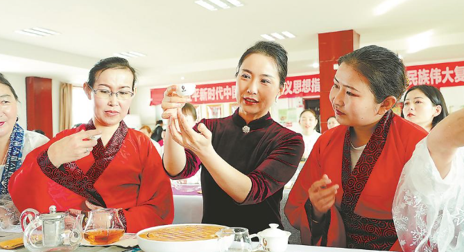 昌吉州茶藝非遺傳承人劉榮(中)在教授茶藝。(受訪者供圖)