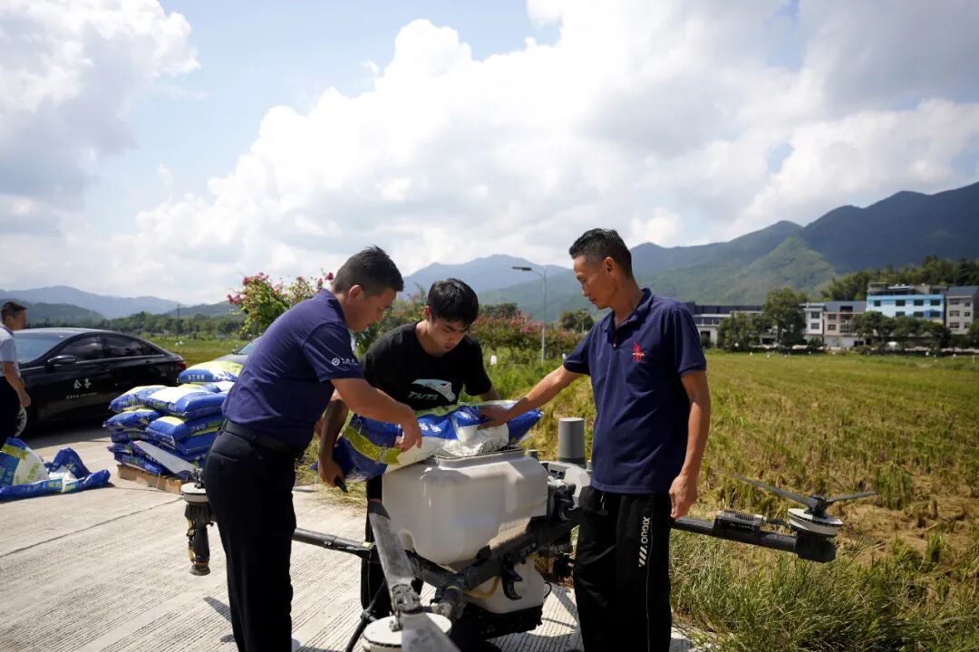 無人機施肥 “這次給1000畝再生稻施的是小分子有機碳復合肥,在全國30多個地方試過,不管是主糧還是果蔬,都能增產提質,效果很穩定。”周偉指著長勢喜人的稻田說。田埂上的試驗正是為了讓農民親眼看到優質農資的效果,一旁石陂鎮種糧大戶陳兆武更是滿臉期待:“第一季稻已經收完,平均畝產快800公斤了。現在追的是第二季肥,按這長勢,再生季畝產預計能有600公斤,10月底就能收割。這兩年跟著供銷社和中農農服做試驗,選對了農資,心里特別踏實。” 這是雙方合作開展的農資試驗,也是浦城縣供銷社與中農農服攜手推進為農服務的生動縮影。今年4月,南平市供銷合作社聯合社與中農農服簽訂合作備忘錄,明確在2025年完成浦城縣石陂鎮、富嶺鎮2個為農服務中心建設,接下來還將完成集智能化農資倉儲配送、農機作業、冷鏈物流、農產品銷售全產業鏈的浦城縣區域性綜合農業服務中心建設項目。 此后,浦城縣供銷社在市供銷社指導和浦城縣委、縣政府支持下,多次與贛州京瑞源公司對接,對方主要領導先后多次到浦城實地調研,還在7月的鄉村振興現場會上,為觀摩嘉賓講解富嶺鎮茅洋綜合農事服務中心的情況。 “我們將在服務中心建設、農資集采集配等方面開展深入合作,共同助力當地農業生產。”余祥根說,作為今年10月全國現場會舉辦點的石陂為農服務中心(浦城縣石陂鎮農事綜合服務中心),正按中農集團的建設標準升級改造,還計劃打造“5星級為農服務中心”。 “我們集中采購中農農服公司的化肥、農藥,質量有保障,零售價還比市場價低18%左右。為農服務中心建成后,還會免費提供農技指導,給我們農戶再生稻種植帶來實打實的收益。”余祥根介紹,該中心將依托供銷渠道,未來年復合肥銷量要不少于800噸(不含尿素),農藥套餐服務面積得超5000畝。