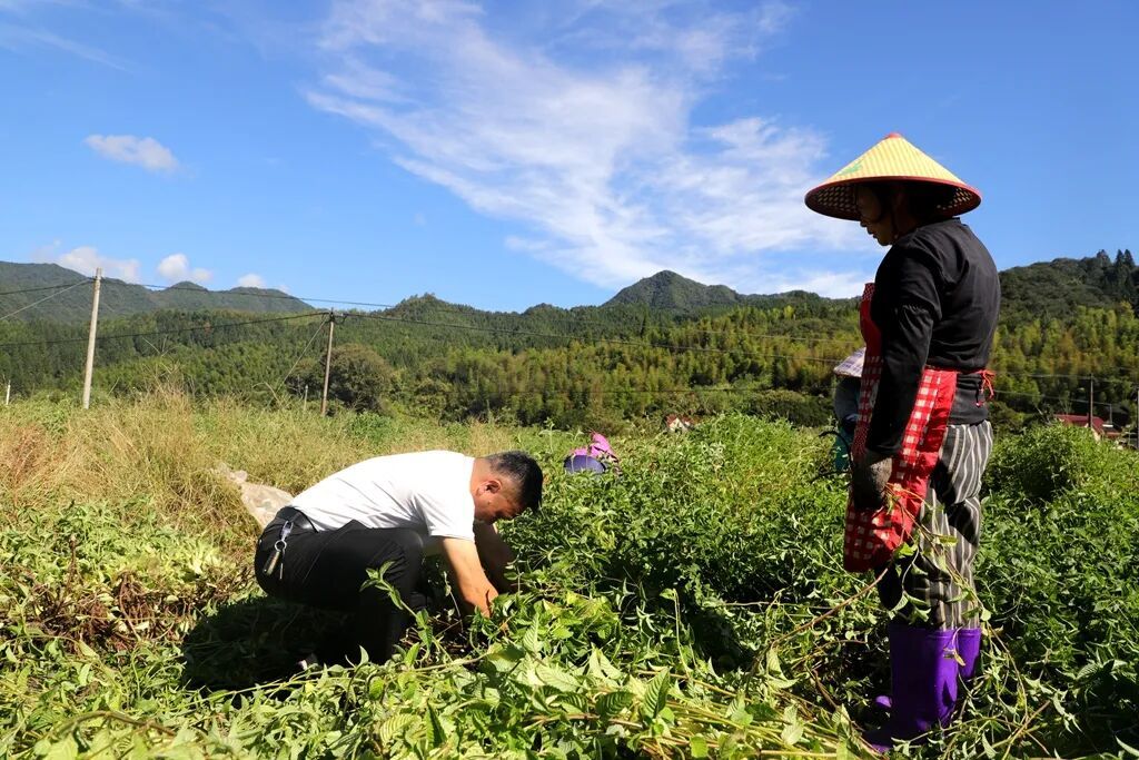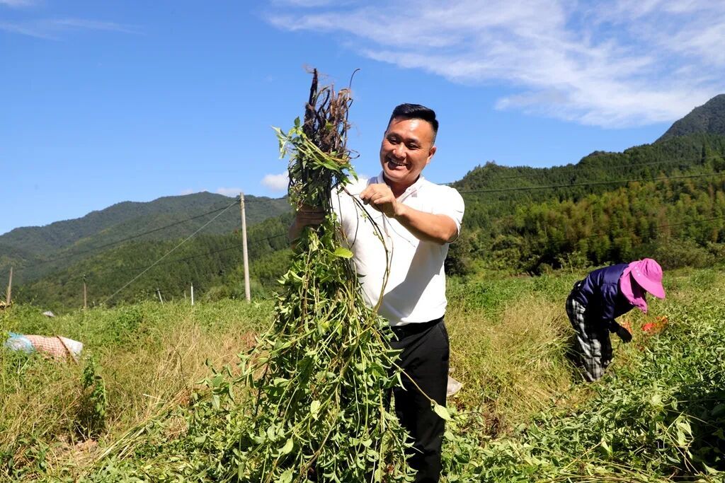 村民在基地里收割 “又是一年豐收季,正好遇到好天氣。農民增產又增收……”周夫標隨手拍了段小視頻,配上文案,“鄉村振興,產業先行。” 2017年,在上海經商的周夫標看中家鄉良好的生態條件和扶持政策,毅然返鄉投身中藥材產業,次年成立了浦城縣騰飛農林開發有限公司,帶領當地農戶共同發展。 “先把仙草往前翻,抓住莖稈部,然后順著根部收割……”周夫標拿起鐮刀,走到仙草前彎下腰,邊示范邊用當地方言向村民講解技巧。 周夫標褲腳沾滿泥濘卻笑意盈盈,抓起一把仙草向記者展示,“這批仙草是4月栽種的,現在剛好達到采收標準。像這樣糧藥套種的模式,既節約耕地資源,又能提高土地綜合利用價值。”
