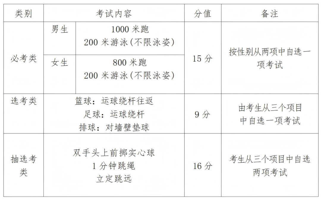 近日 漳州、寧德、泉州 確定2026年體育中考項(xiàng)目 具體內(nèi)容一起來看 ↓↓↓ 漳州市 11月4日,2026年漳州市初中畢業(yè)升學(xué)體育考試,抽選考類測(cè)試項(xiàng)目抽簽結(jié)果公布: 抽選考類六選三是:50米跑、1分鐘跳繩、1分鐘仰臥起坐??忌蓮娜齻€(gè)項(xiàng)目中自選2項(xiàng)考試。 現(xiàn)行的籃球、足球、排球“三大球”抽考項(xiàng)目改為選考,考生可從三個(gè)項(xiàng)目中自選1項(xiàng)考試。 在考試內(nèi)容方面,體育與健康基本知識(shí)考試將調(diào)整為日常檢測(cè),原中考分值調(diào)整至運(yùn)動(dòng)技能測(cè)試。 中考體育分值結(jié)構(gòu)上,保持總分值40分不變,具體分配為:必考類15分(1000米/800米跑、200米游泳)、選考類9分(“三大球”)、抽選考類16分(50米跑、立定跳遠(yuǎn)、1分鐘跳繩、引體向上/斜身引體、雙手頭上前擲實(shí)心球、1分鐘仰臥起坐)。 寧德市 11月4日,寧德市教育局組織開展了2026年體育中考身體素質(zhì)與運(yùn)動(dòng)能力測(cè)試抽選考項(xiàng)目現(xiàn)場(chǎng)抽選活動(dòng),并發(fā)布《關(guān)于寧德市2026年體育中考抽選考項(xiàng)目抽選結(jié)果的通知》,確定2026年寧德市體育中考抽選考項(xiàng)目。 此次抽選考類從六項(xiàng):50米跑、立定跳遠(yuǎn)、1分鐘跳繩、引體向上(男)/斜身引體(女)、雙手頭上前擲實(shí)心球、1分鐘仰臥起坐中隨機(jī)抽選三項(xiàng)。 經(jīng)現(xiàn)場(chǎng)公開隨機(jī)抽選,最終確定: 抽選考項(xiàng)目為:50米跑、1分鐘跳繩、1分鐘仰臥起坐。(考生從這三個(gè)項(xiàng)目中自選兩項(xiàng)進(jìn)行考試) 必考類項(xiàng)目為:1000米(男)/800米(女),200米游泳(不限泳姿),考生根據(jù)性別自行選擇一項(xiàng)考試。 選考類項(xiàng)目為:籃球:運(yùn)球繞桿往返、足球:運(yùn)球繞桿、排球:對(duì)墻壁墊球,由考生從三個(gè)項(xiàng)目中自選一項(xiàng)考試。 考試分值