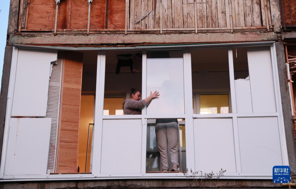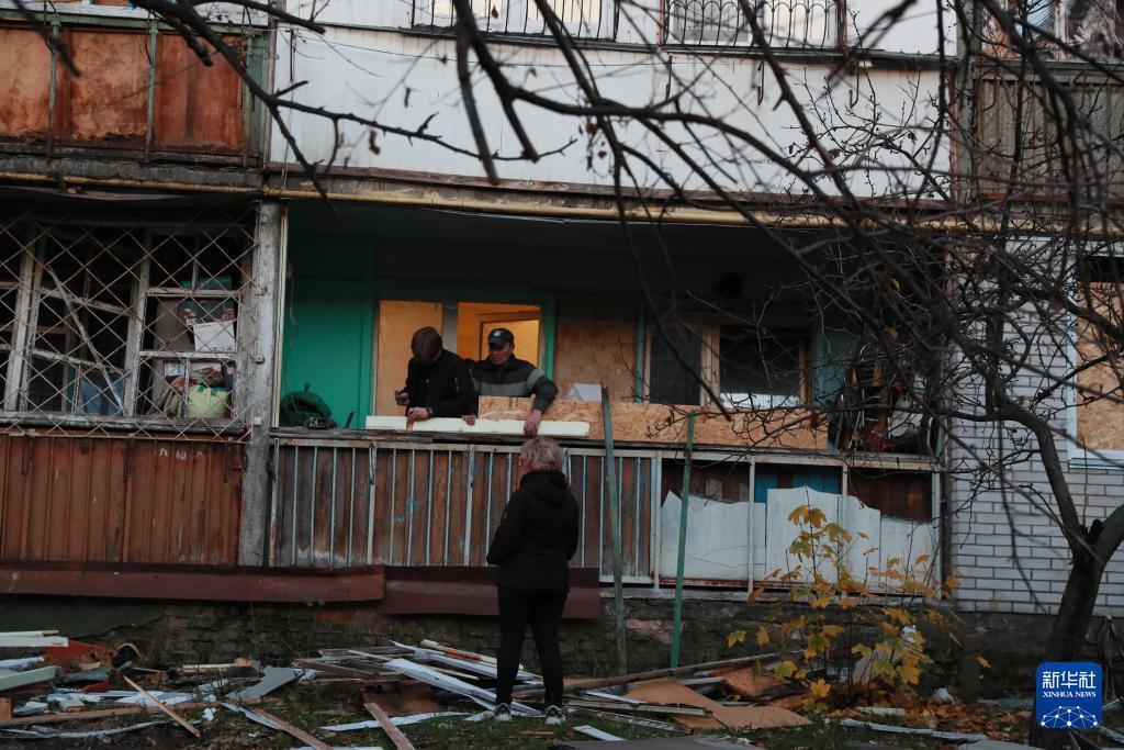 11月14日,在烏克蘭首都基輔市第聶伯區(qū),當(dāng)?shù)鼐用駥?duì)遭受空襲損毀的房屋進(jìn)行修繕加固。 當(dāng)天凌晨,基輔遭到俄軍大規(guī)模空襲。 新華社記者 李東旭 攝