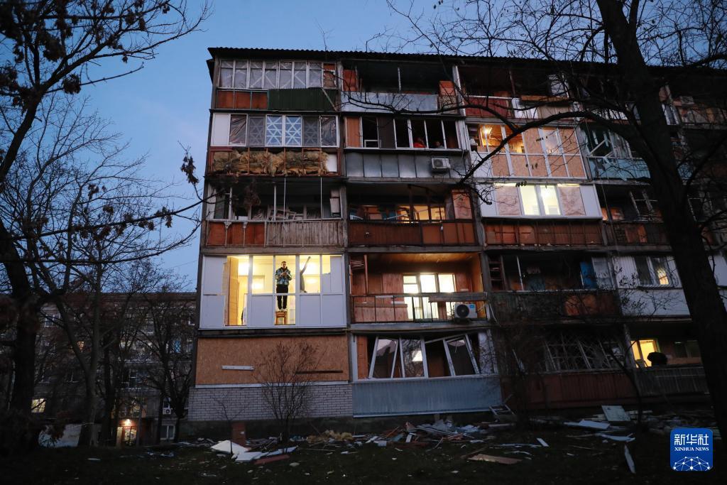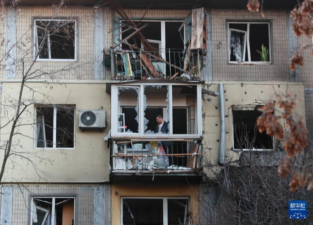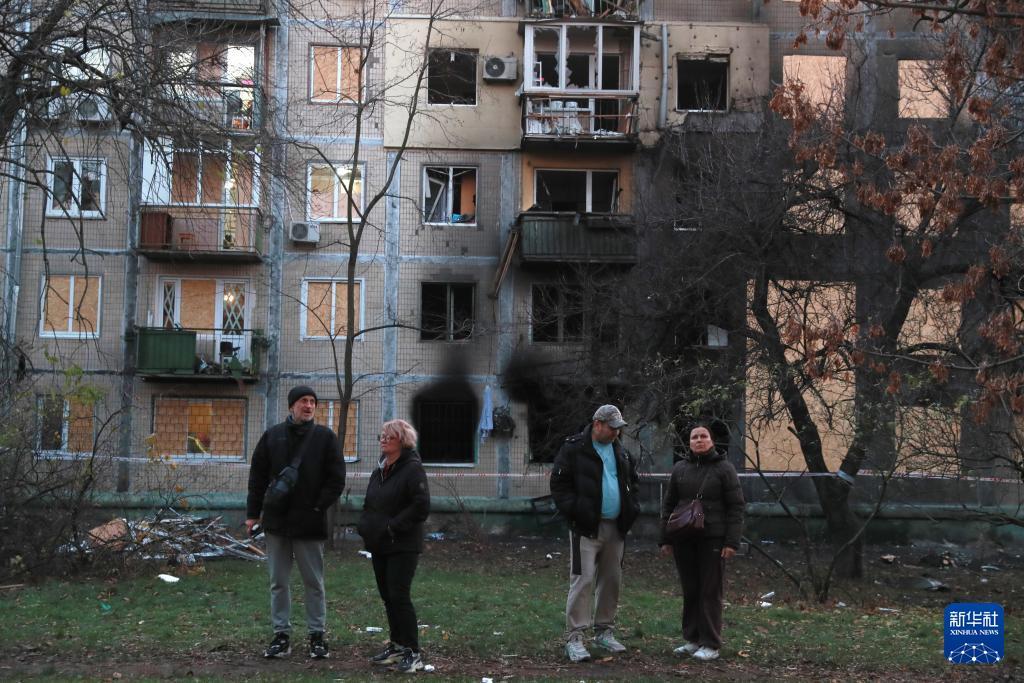 11月14日,在烏克蘭首都基輔市第聶伯區(qū),當(dāng)?shù)鼐用裾驹谠馐芸找u損毀的房屋前。 當(dāng)天凌晨,基輔遭到俄軍大規(guī)模空襲。 新華社記者 李東旭 攝
