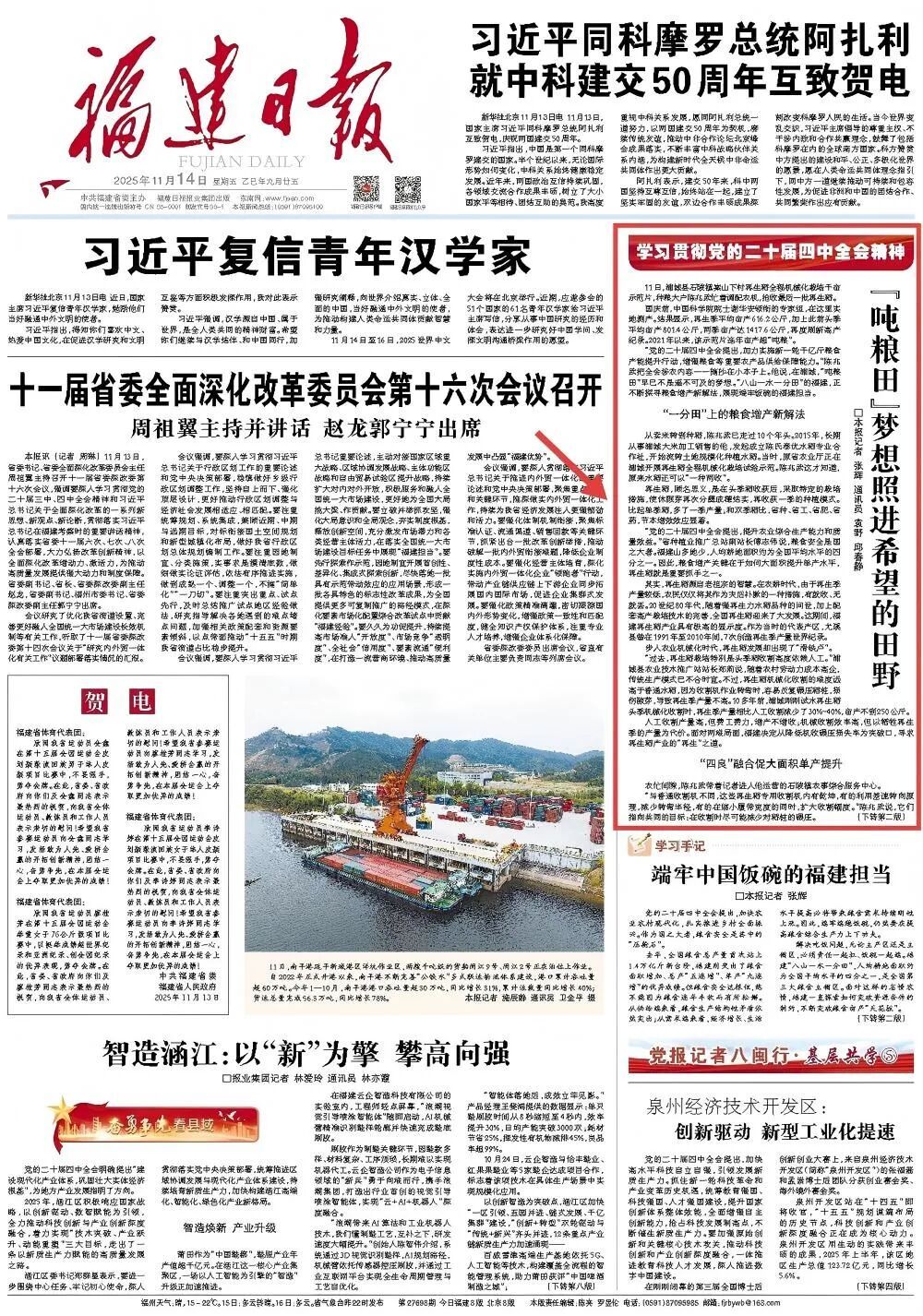 11月14日,福建日報頭版刊登我縣學習貫徹黨的二十屆四中全會精神專題報道《“噸糧田”夢想照進希望的田野》 11日,浦城縣石陂鎮案山下村再生稻全程機械化栽培千畝示范片,種糧大戶陳兆武忙著調配農機,搶收最后一批再生稻。 國慶前,中國科學院院士謝華安領銜的專家組,在這里實地測產。結果顯示,再生季平均畝產616.2公斤,加上此前頭季平均畝產801.4公斤,兩季畝產達1417.6公斤,再度刷新高產紀錄。2021年以來,該示范片連年畝產超“噸糧”。 “黨的二十屆四中全會提出,加力實施新一輪千億斤糧食產能提升行動,增強糧食等重要農產品供給保障能力。”陳兆武把全會涉農內容一一摘抄在小本子上。他說,在浦城,“噸糧田”早已不是遙不可及的夢想。“八山一水一分田”的福建,正不斷探尋糧食增產新解法,展現端牢飯碗的福建擔當。 “一分田”上的糧食增產新解法 從賣米轉到種稻,陳兆武已走過10個年頭。2015年,長期從事浦城大米加工銷售的他,發起成立陳氏泰優水稻專業合作社,開始流轉土地規模化種植水稻。當時,原省農業廳正在浦城開展再生稻全程機械化栽培試驗示范。陳兆武這才知道,原來水稻還可以“一種兩收”。 再生稻,顧名思義,是在頭季稻收獲后,采取特定的栽培措施,使休眠芽再次分蘗成穗結實,再收獲一季的種植模式。比起單季稻,多了一季產量;和雙季稻比,省種、省工、省肥、省藥,節本增效效應顯著。