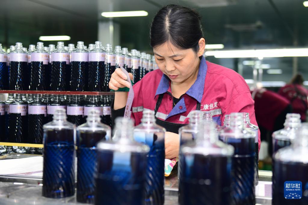 11月27日,在鄆城縣丁里長街道煙鄆科技產業園,工作人員為酒瓶貼花。 近年來,山東省菏澤市鄆城縣丁里長街道鏈條式、集群化發展酒類包裝產業,并將采煤塌陷區綜合治理與發展特色養殖業相結合,不斷通過產業興旺助推鄉村振興。 新華社記者 郭緒雷 攝