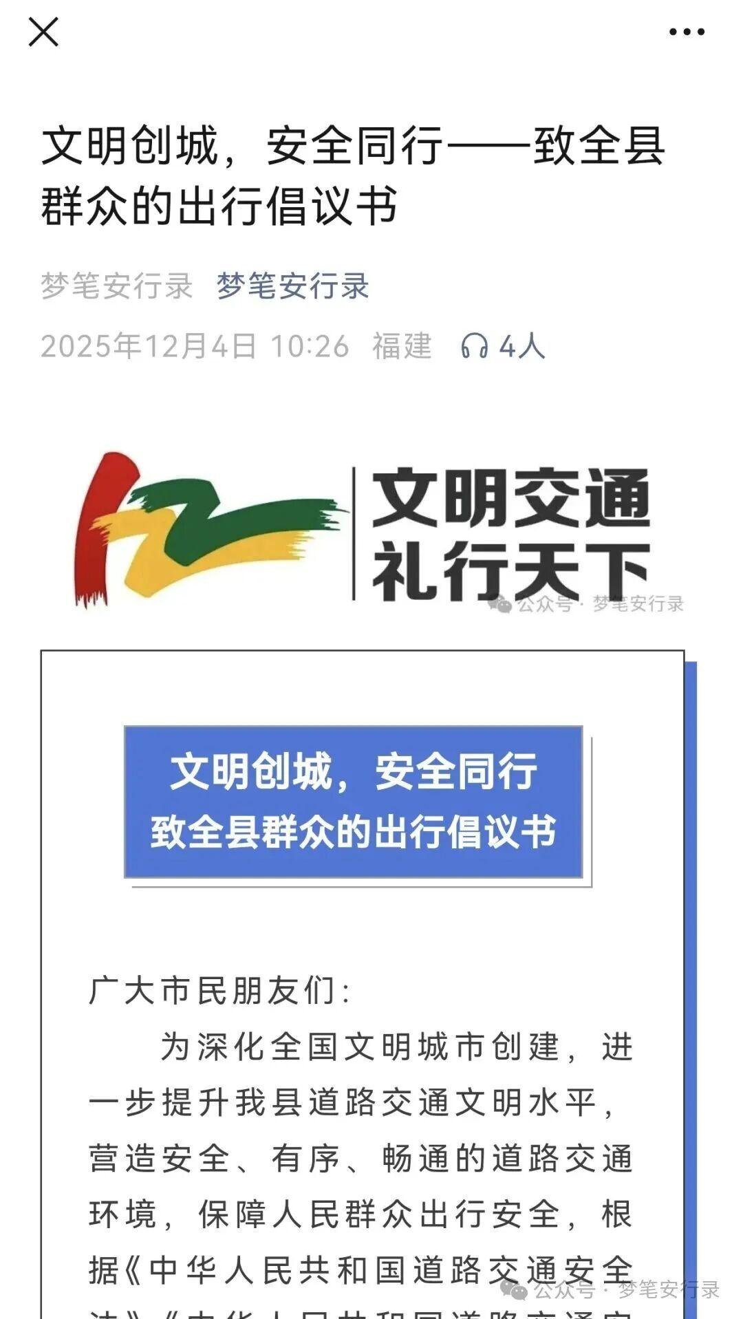 此外,大隊充分利用微信公眾號定期發(fā)布交通安全提示、違法行為曝光、典型案例剖析。近日,還通過公眾號向全縣群眾發(fā)布了一封《文明創(chuàng)城,安全同行》的出行倡議書,呼吁全體交通參與者攜手共同維護安全、文明、和諧的道路交通環(huán)境。 浦城公安交警在此呼吁 希望每一位市民,從自身做起 從每一次出行做起 開文明車、行文明路、做文明人 共同為創(chuàng)建文明城市貢獻一份力量